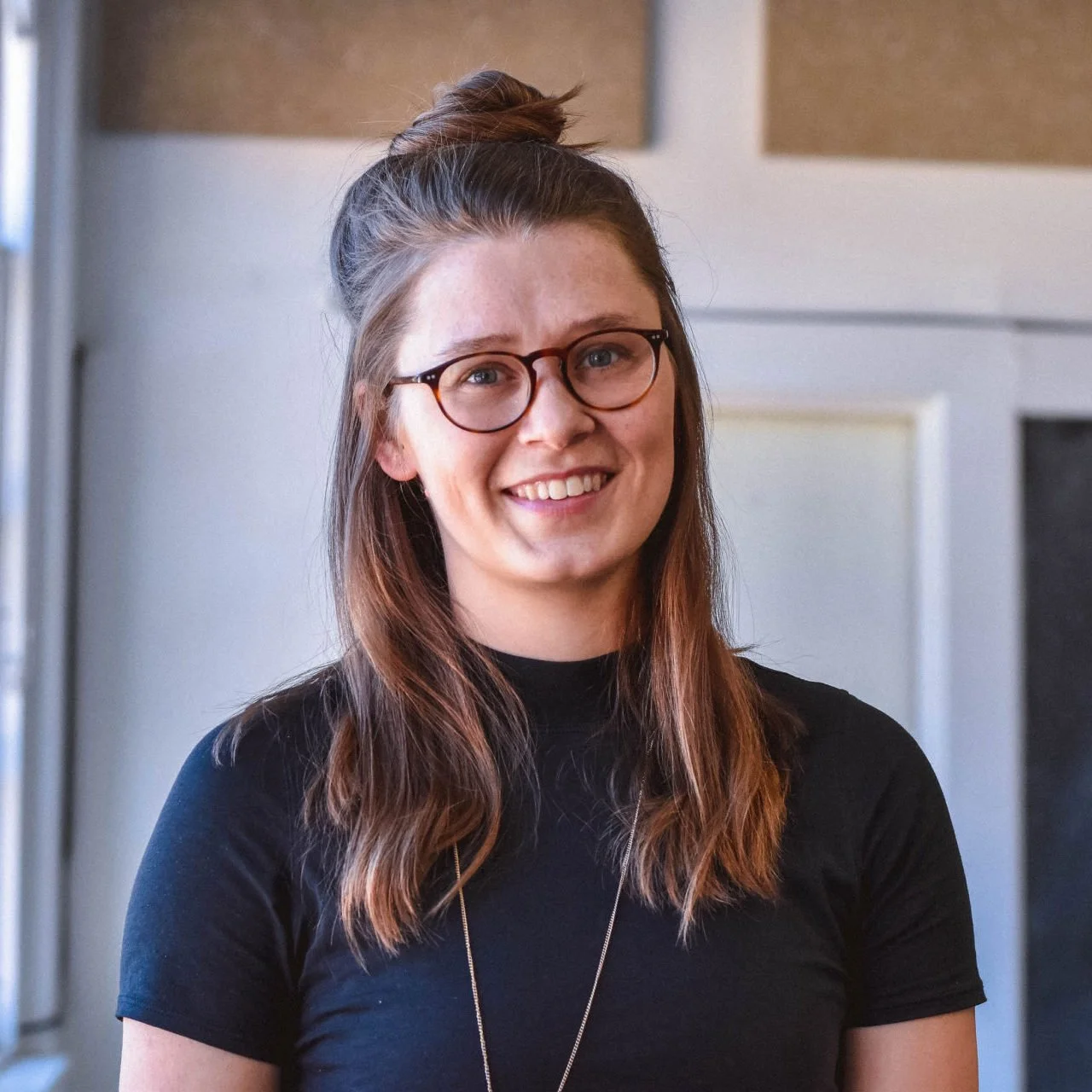 A woman with glasses and long brown hair, partly pulled up, smiling at the camera.