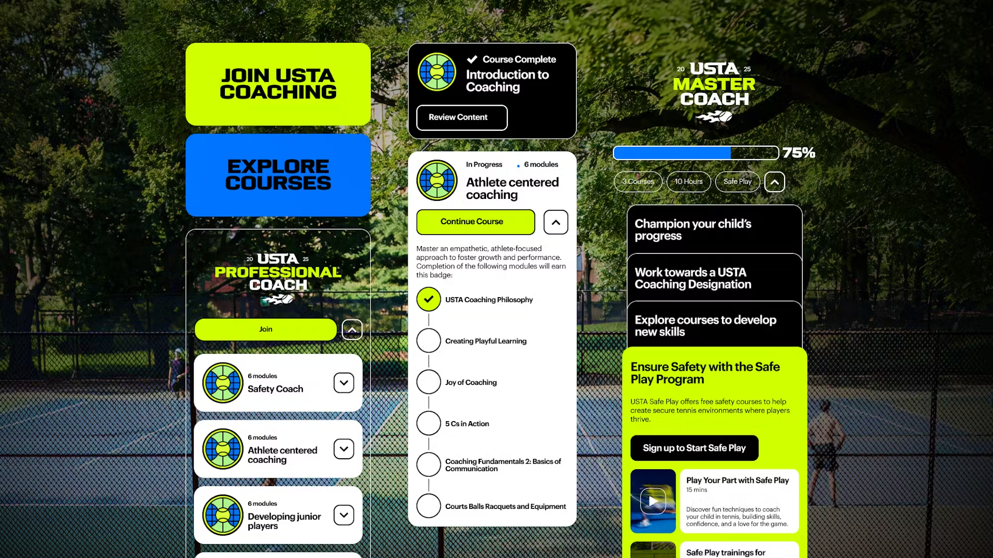 Digital interface on a tennis court background showing options to join USTA coaching, explore courses, and track progress, with progress bar at 75%.