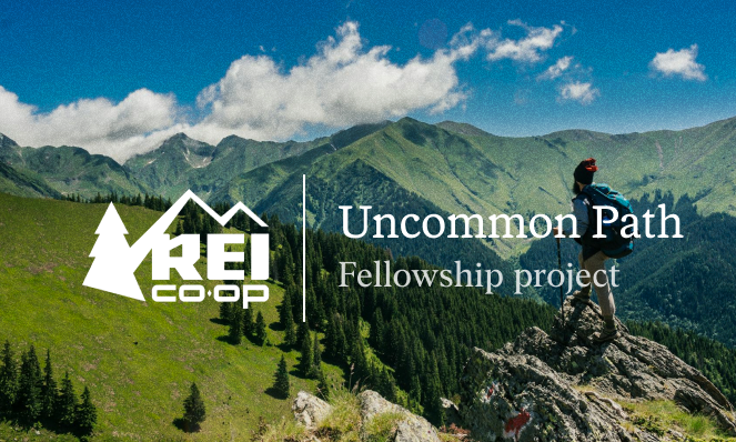Hiker standing on a rocky outcrop overlooking a green mountain landscape, with a logo for REI Co-op and text that reads "Uncommon Path Fellowship Project".